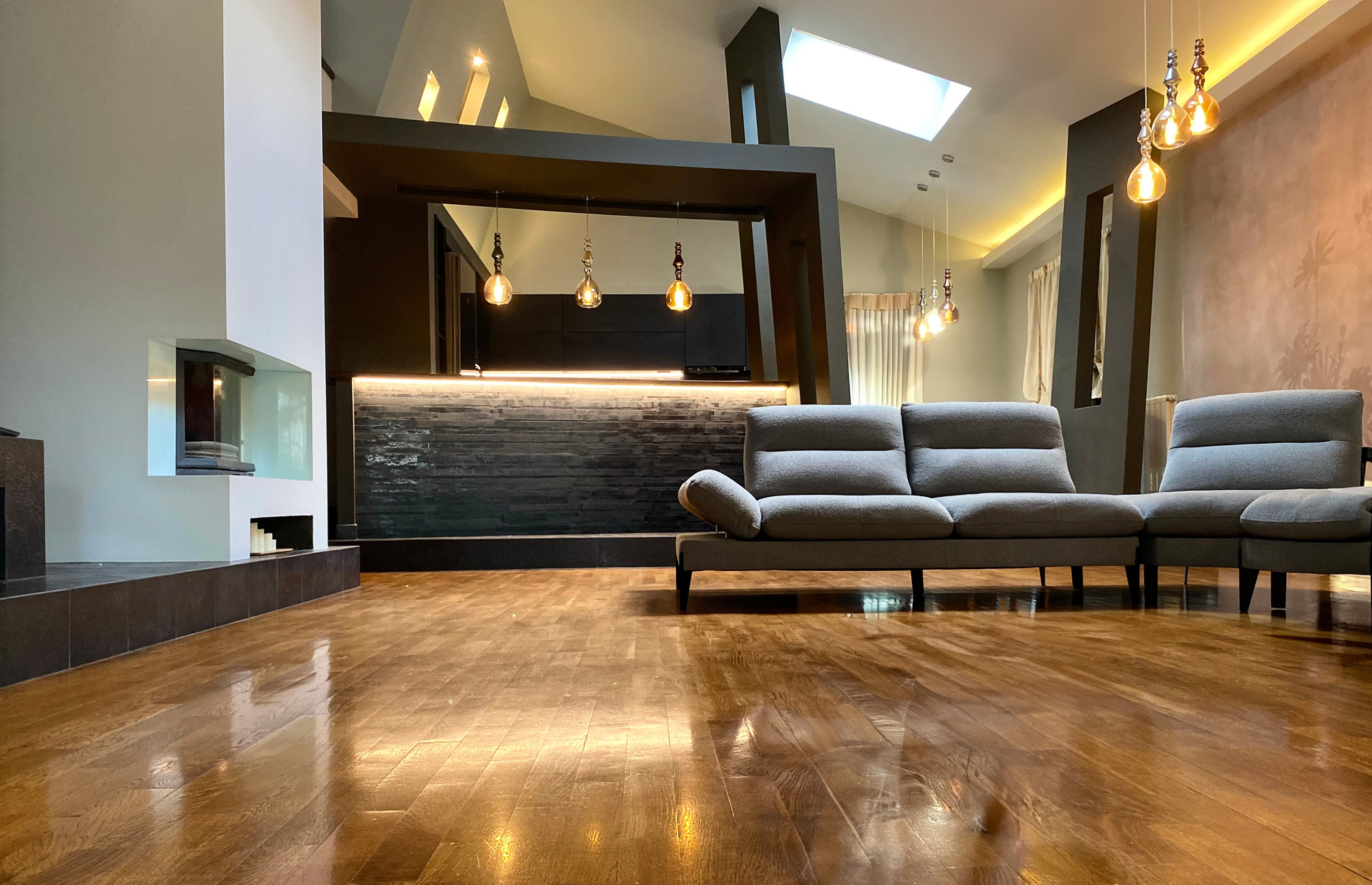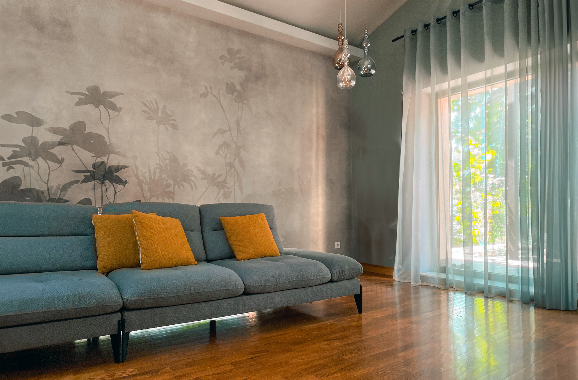 Actorul principal al noii scenografii este tapetul cu un desen floral deosebit, în nuanțe delicate, expus pe un perete lung și vizibil chiar de la intrare. Pardoseală executată din parchet de cea mai bună calitate, canapeaua modernă în linii simple, pendulele din sticlă de Murano, șemineul, toate aceste elemente întregesc aspectul rafinat și exclusivist.