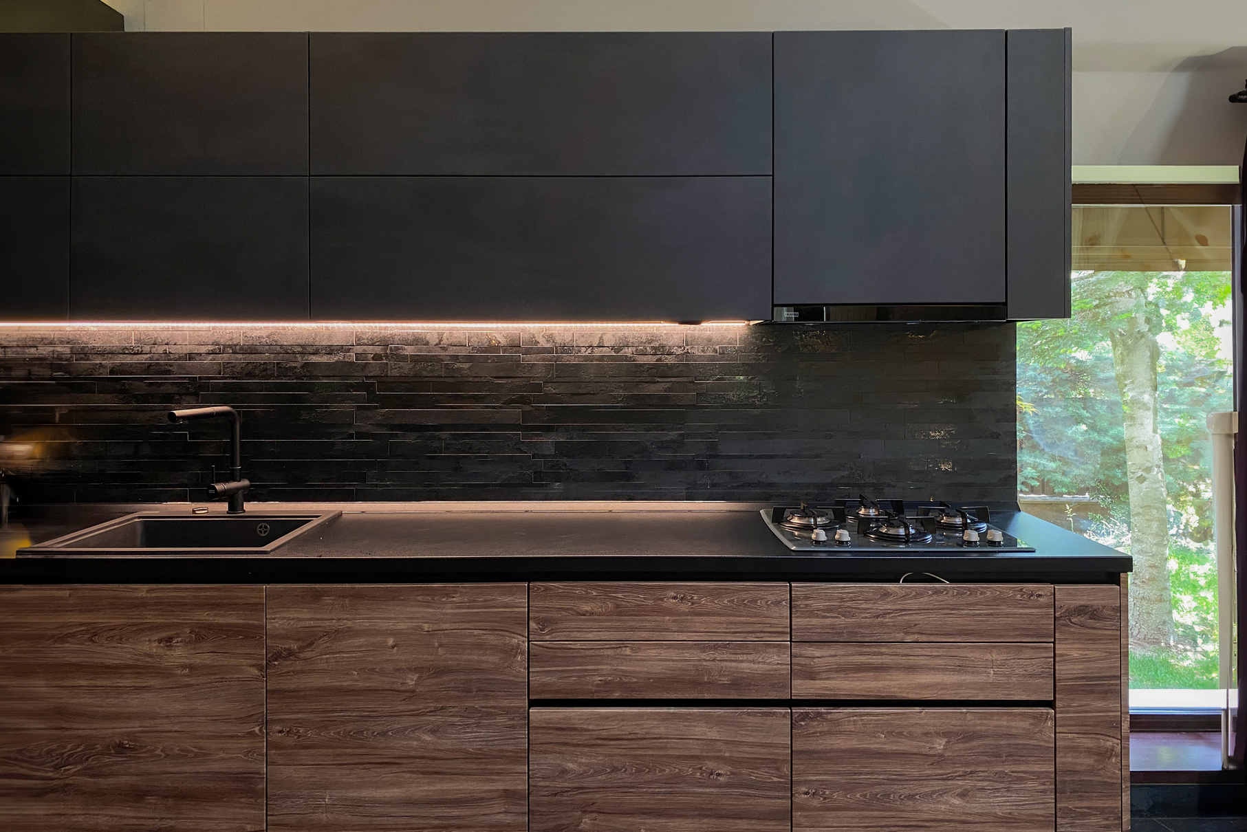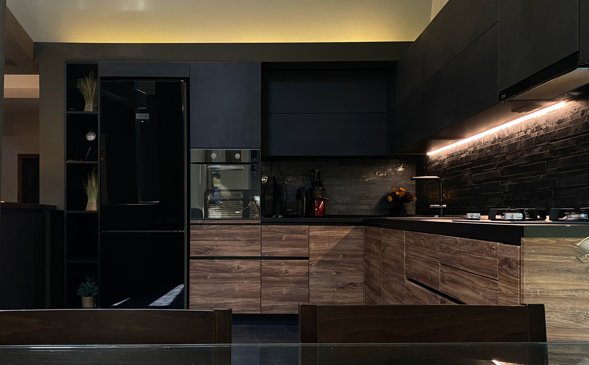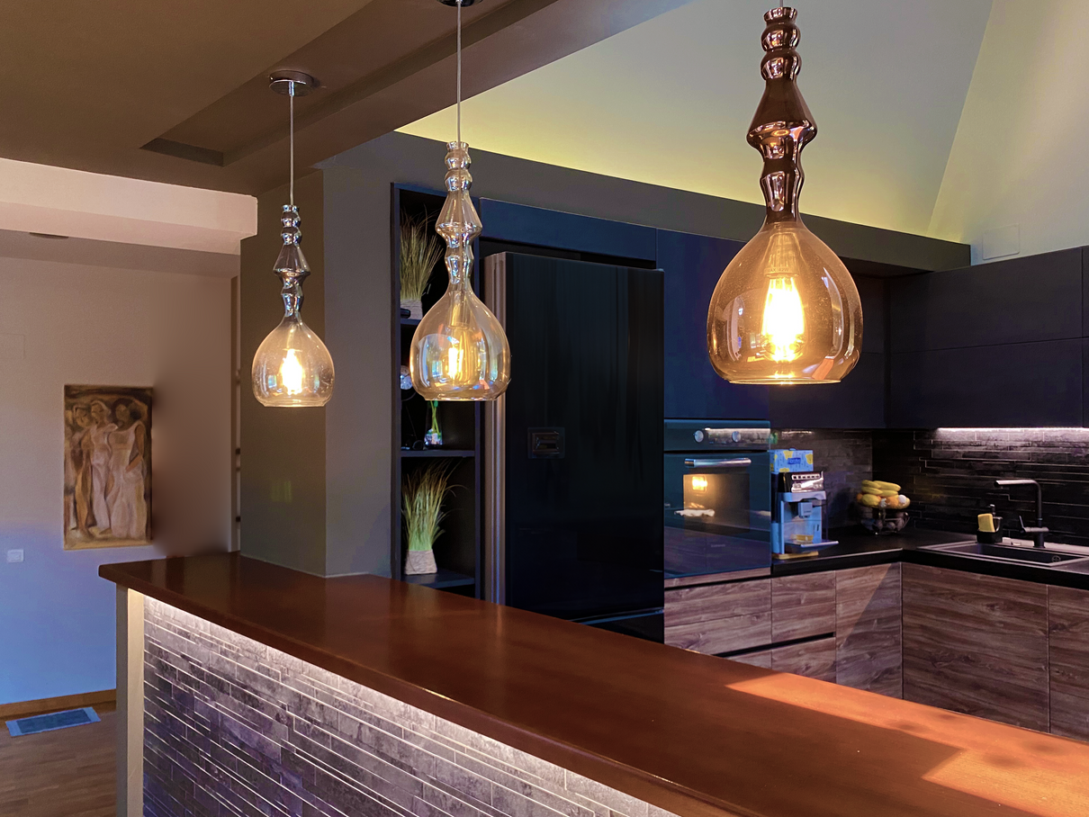 Bucătăria deschisă se ascunde delicat în spatele unui bar placat cu ardezie neagră. Volumele, materialele, culorile și lumina dau o atmosfera elegantă, primitoare și caldă.