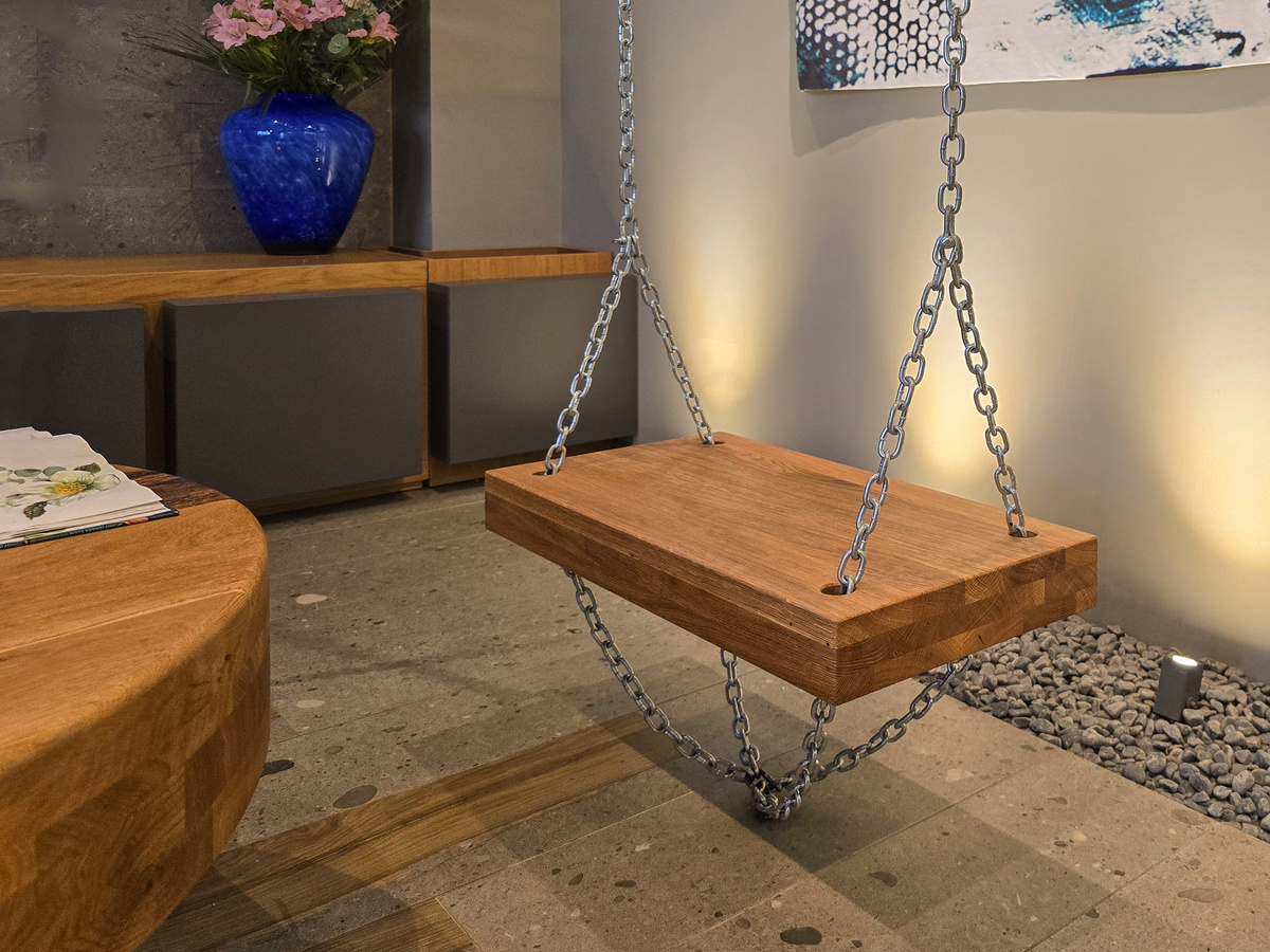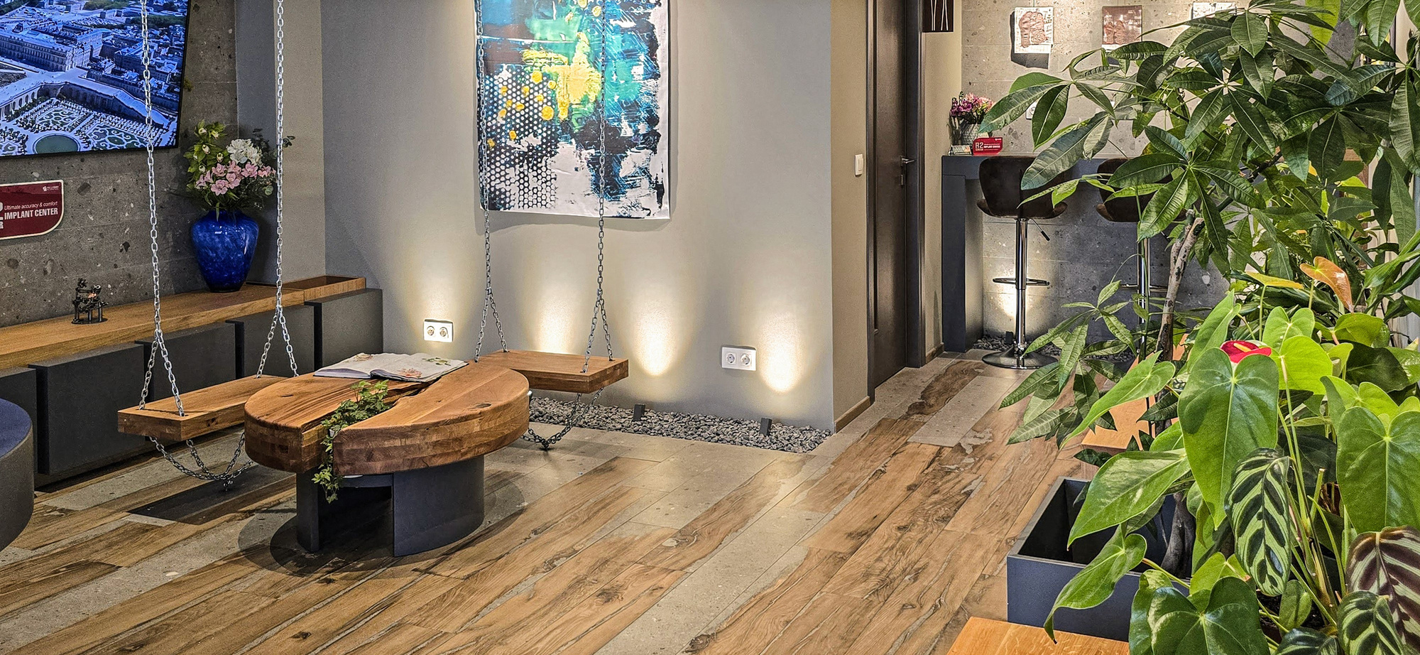 Atmosfera caldă creată prin amenajare detașează pacientul de scopul vizitei, îndemnând la relaxare.
