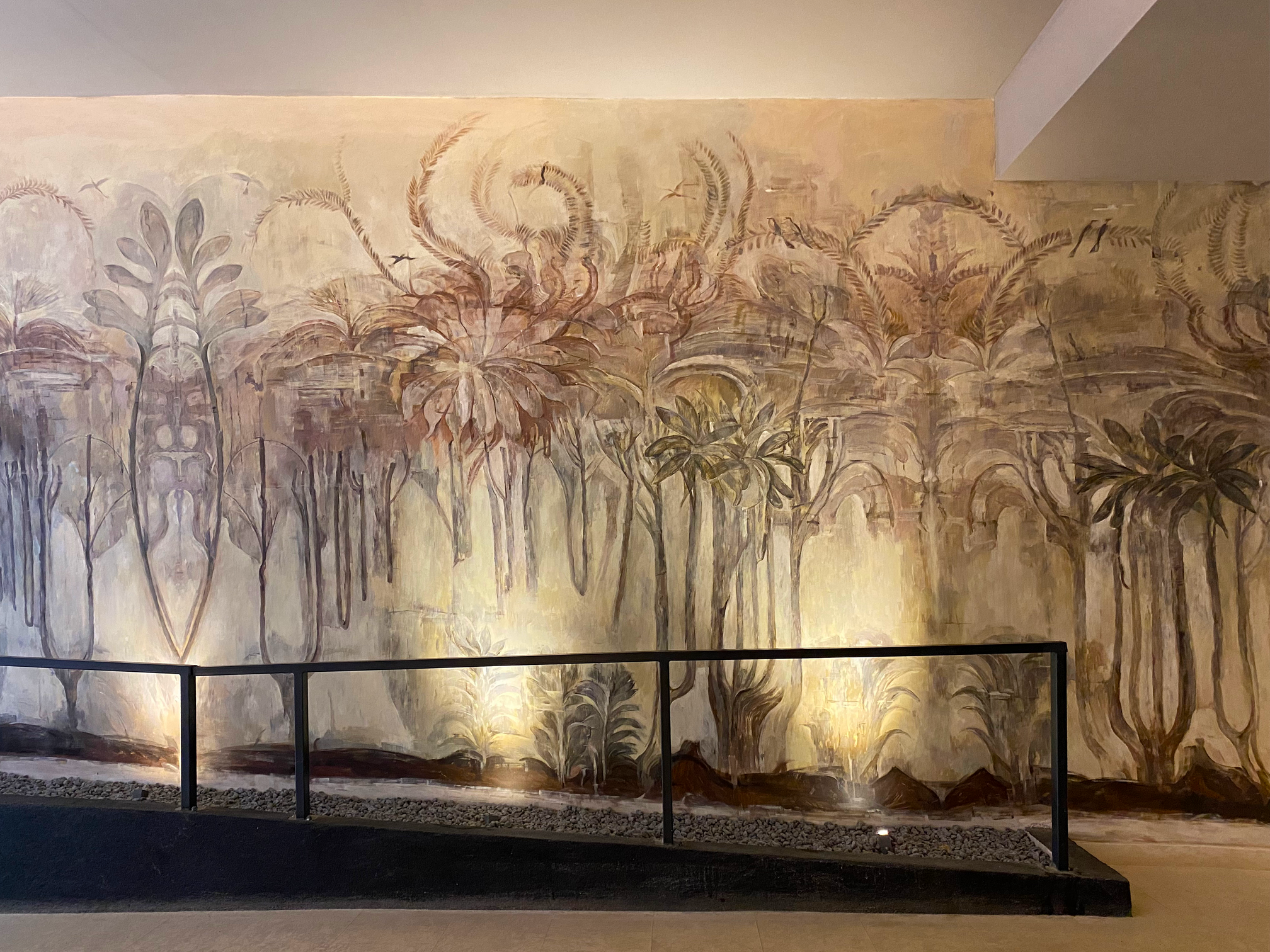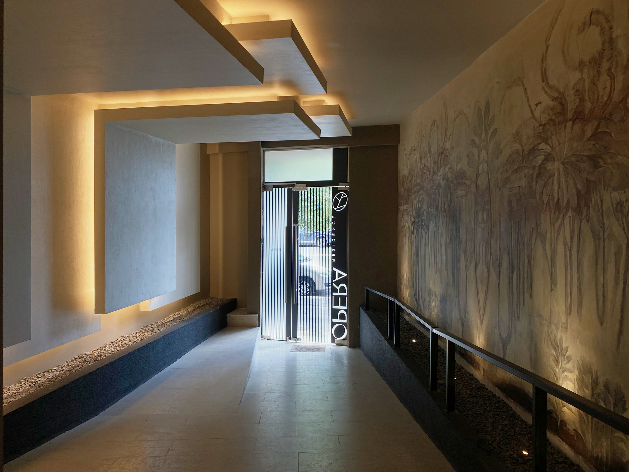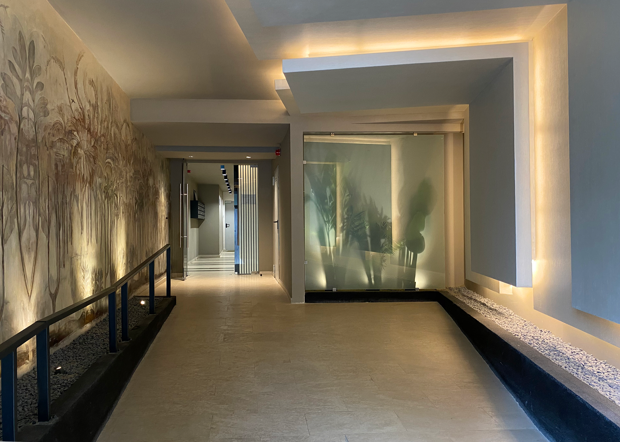 Envisioned as a statement piece for the residents, the entrance lobby aims to convey the same refined and exclusive atmosphere. The narrative of nature is authentically represented through a mural painting that runs along the entrance, further enhanced by the shadows of plants placed behind a frosted glass panel. The mural, executed with great sensitivity and skill by artist Daniela Nemțanu, employs warm, earthy tones. The result is a unique creation that fosters a sophisticated and welcoming ambiance, representing the gateway to an exclusive community in the heart of Bucharest.