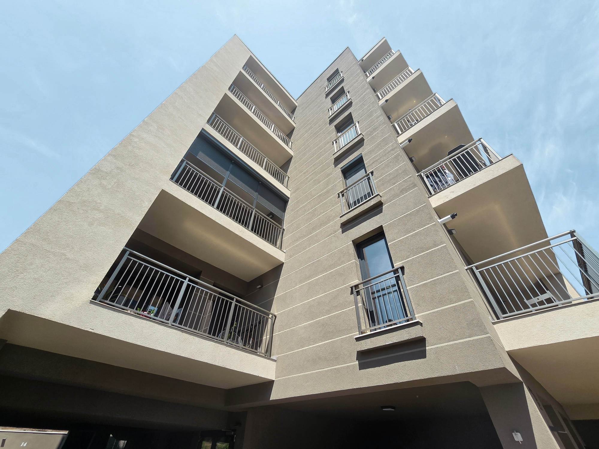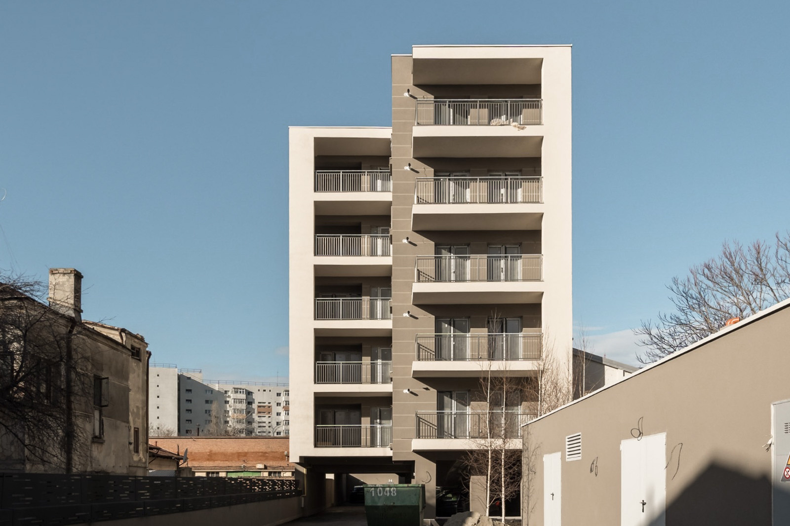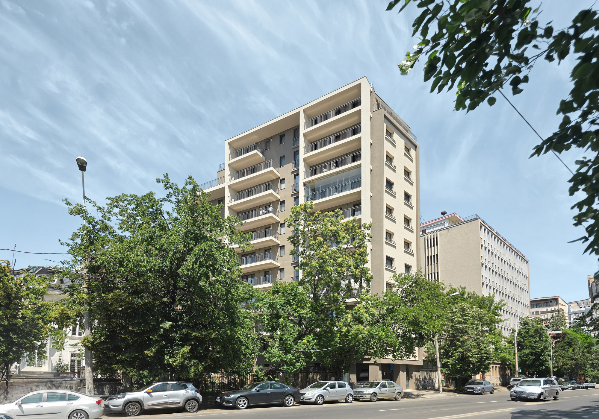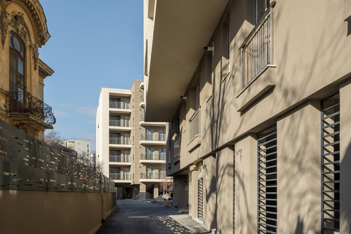 The residential complex comprises two buildings with five and ten stories, respectively. Situated on a narrow, deep plot with limited street frontage, the project presented numerous design challenges. The primary challenge was to find an elegant solution for addressing the aesthetic concerns of a tall yet narrow volume on the main facade.